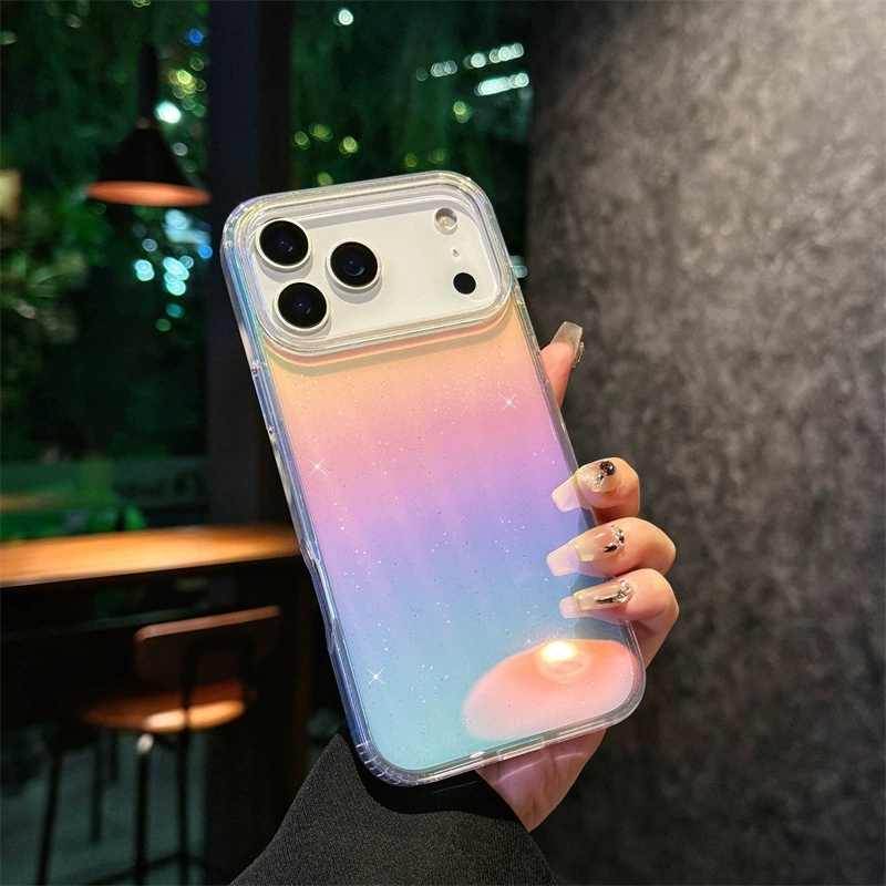This phone case features a plated gradient finish with transparent glitter texture. Multiple styles (magnetic, single case, etc.) are available, compatible with Apple 17 Pro/17 Air. Stylish, durable and shockproof.