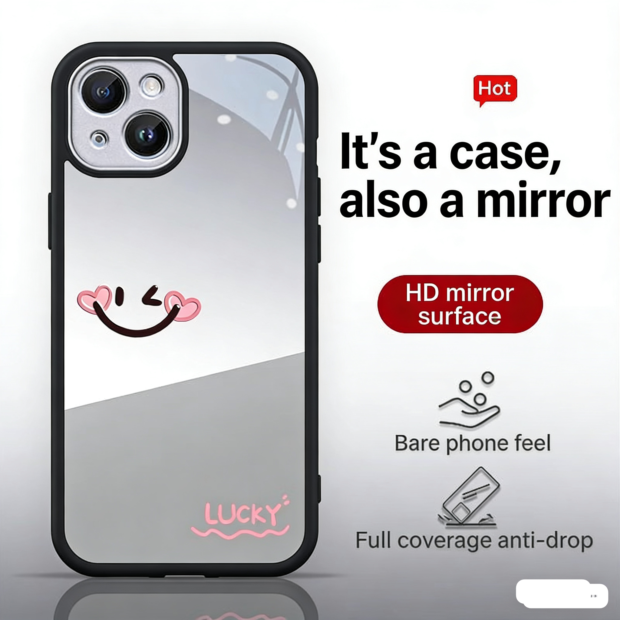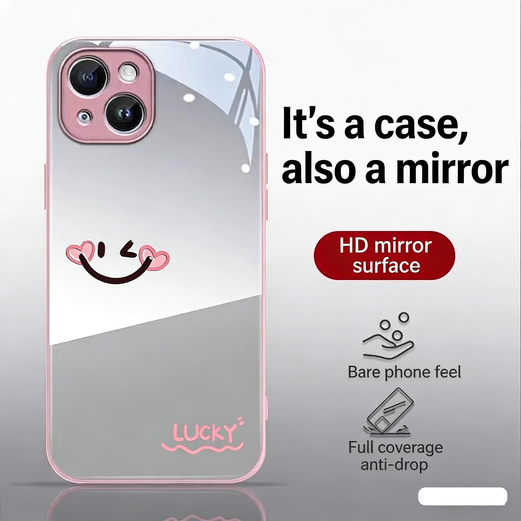 Girls! This love heart smiley mirror phone case💄✨🥰🌸💖 is a must-have for delicate girls going out! The HD mirror back panel is both a phone case and a makeup mirror, with cute love heart smiley prints and the LUCKY lucky word. Colors like pink, blue, and black are full of girlishness, and the full coverage anti-drop design can give your phone full protection, compatible with multiple iPhone models. Put it on your phone, and you’ll instantly be the most dazzling one in the crowd. Whether it’s shopping and touching up makeup, dating and taking photos or daily commuting, the moment you lift your hand to take your phone, you can easily create a delicate makeup look. Stocks of such a practical and beautiful phone case are running low, so grab it now to be a lucky girl with her own makeup mirror~