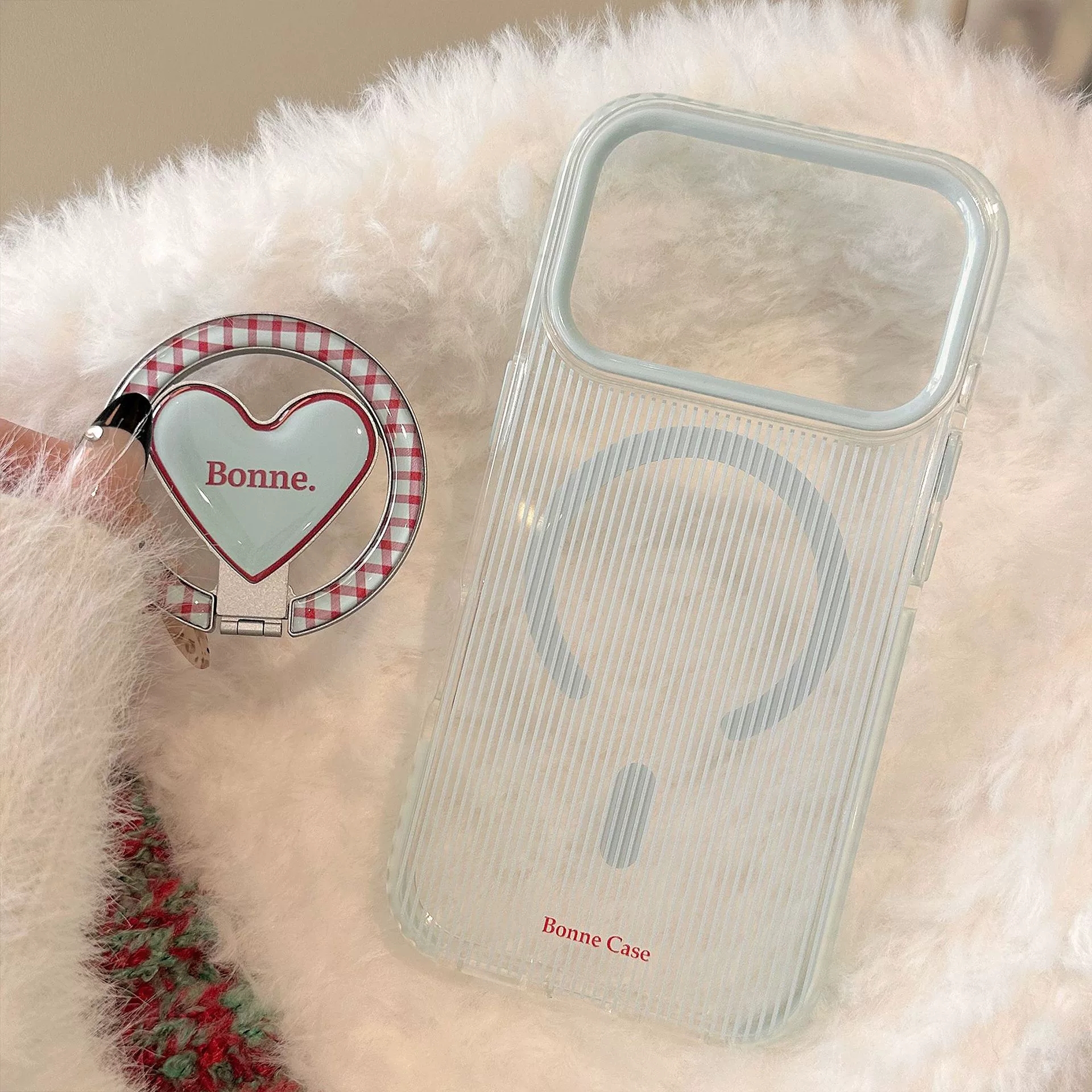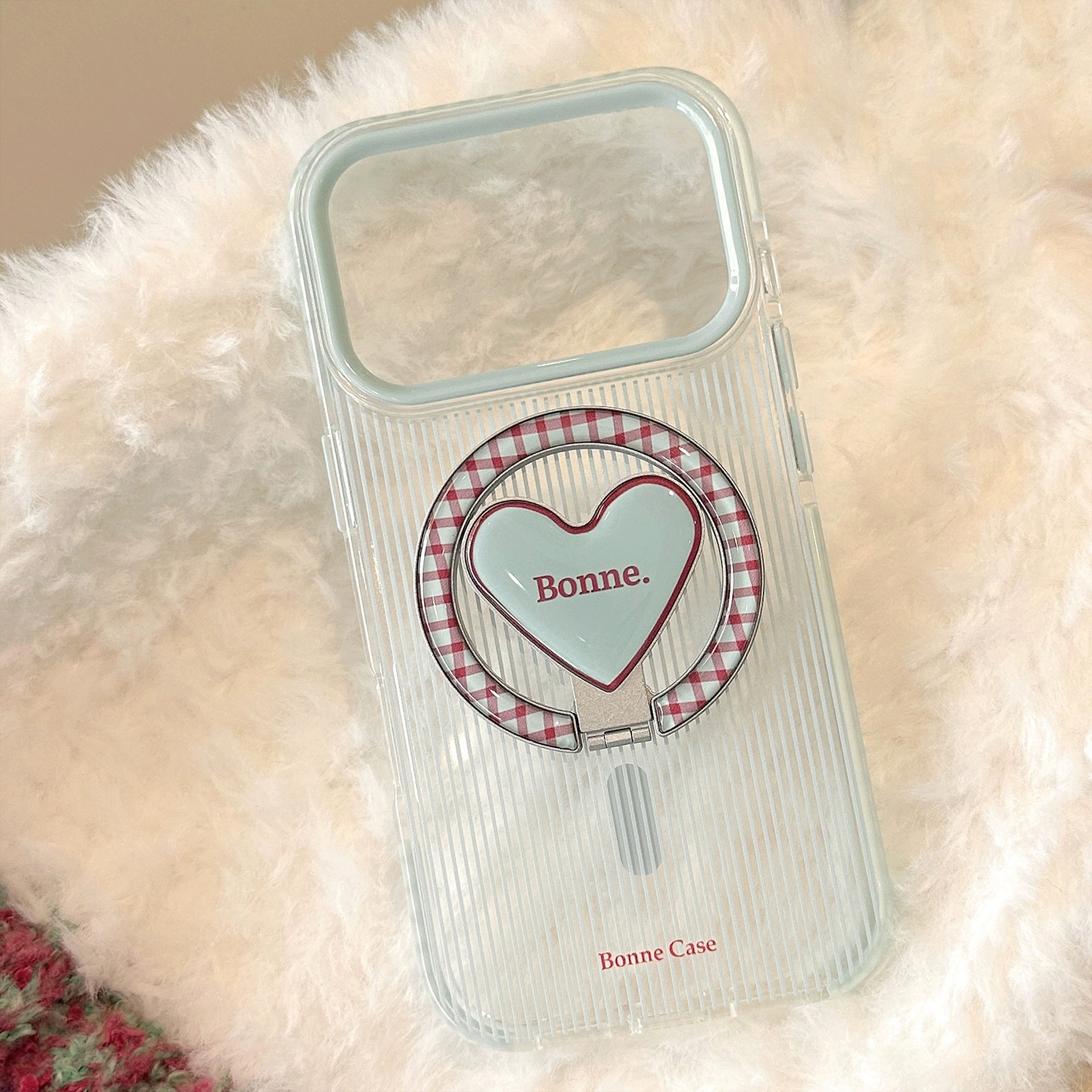 Two styles: pink edge & blue edge fine stripe✨ Heart magnetic stand is super sweet and cute💓 Compatible with iPhone17promax/15📱 Full of transparent texture💎 You’ll be the sweet girl spotlight when wearing it🎀 Grab it fast!