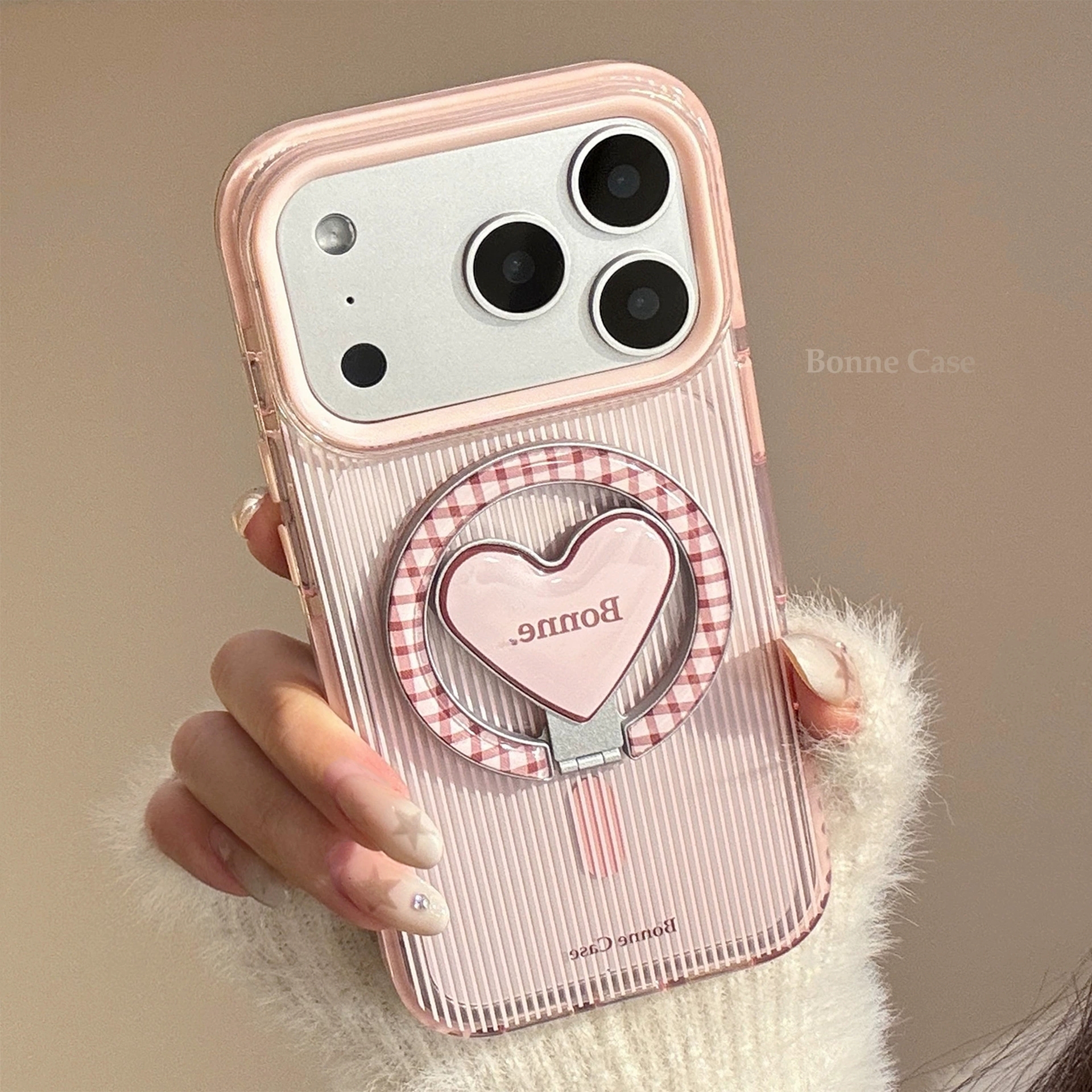 Pink Brown Stripe Heart💖 iPhone17promax Magnetic Stand Fine Stripe Girlish Phone Case