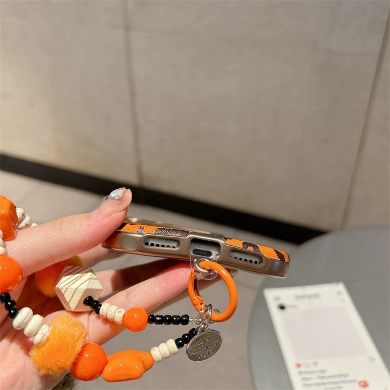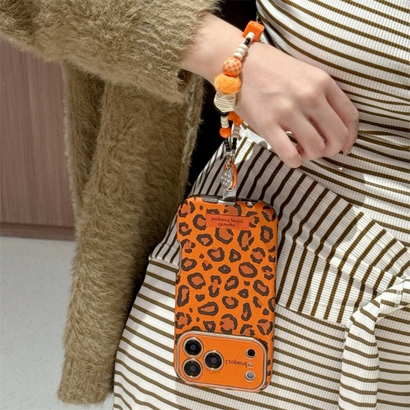Vintage Orange Leopard Print🐆 Phone Case for iPhone17pro/16pro (Large View Window & Bracelet Style)